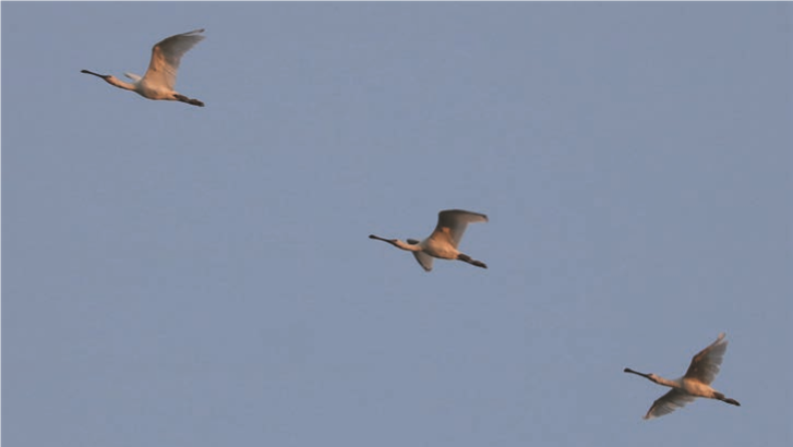 A bit of sea watching yielded 4 species of gulls, some distant flocks of Common Scoter, a Red-throated Diver and a Common Guillemot. Whilst being pre-occupied towards the sea, there was a shout of “Spoonbill!” and a resplendent trio of these graceful birds flew over us!